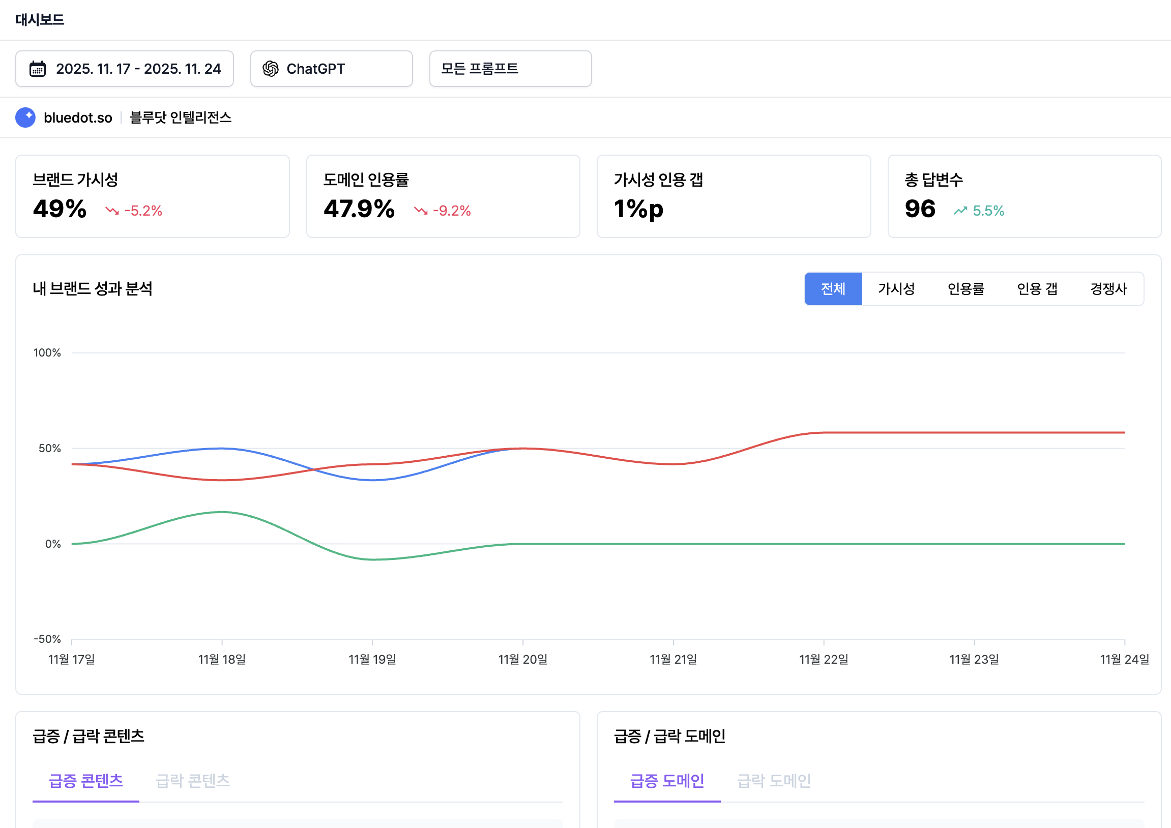 대시보드에서 제공되는 블루닷 인텔리전스 인덱스(BII)는 브랜드 가시성과 AI 답변 긍부정 지수를 종합한 지표로, 기업 브랜드들의 AI 검색 내 위상을 일 단위로 체크할 수 있도록 도와준다. BII 지수의 등락에 따라 필요한 조치를 즉각 취할 수 있도록 지원한다. 향후 경쟁사 비교 기능이 추가되면, 자사의 취약점을 한눈에 모니터링할 수 있다.