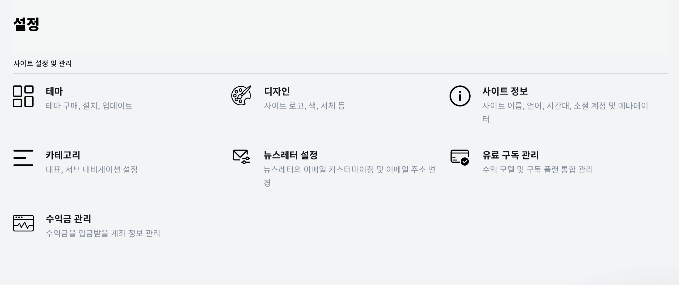설정 내 메뉴도 일부 변경됐습니다. 같은 메뉴에 묶여있지 않아야 할 것들은 분리를 했고요. 수익금 관리와 같은 편의성을 높이는 메뉴는 신설했습니다. 대표적으로 유료 구독 관리 메뉴는 그간 '결제 설정(관리)' 안에 포함돼 있었는데요. 결제 설정과 유료 구독 설정은 같은 메뉴로 분류되기엔 이질성이 높았습니다. 이를 분리해서 쉽게 확인할 수 있도록 변경했습니다.