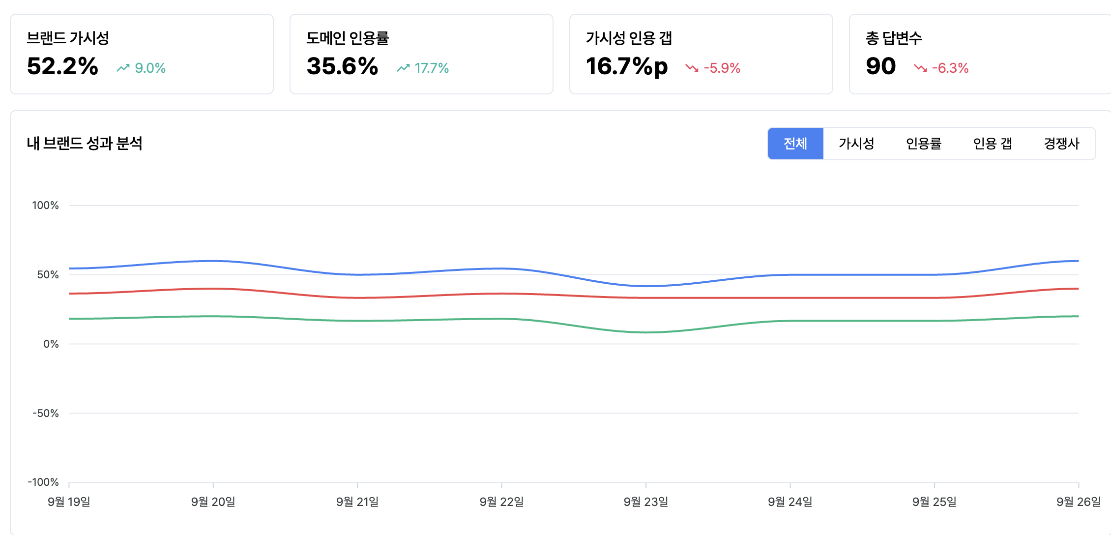 블루닷 인텔리전스 고객분들을 만나다 보면, GEO와 관련 2가지를 가장 궁금해 하시더군요. (1) 우리 브랜드가 AI 검색에 잘 나타나고 있는지 (2) 우리 사이트가 자주 인용되고 있는지 입니다. 통상 저희는 1을 브랜드 가시성을 측정하고 (2)를 도메인 인용률로 계산합니다. 사실 두 지표는 독립적인 관계이긴 합니다. 하지만 두 지표를 잘 결합하면 새로운 인사이트를 도출해 낼 수 있습니다.