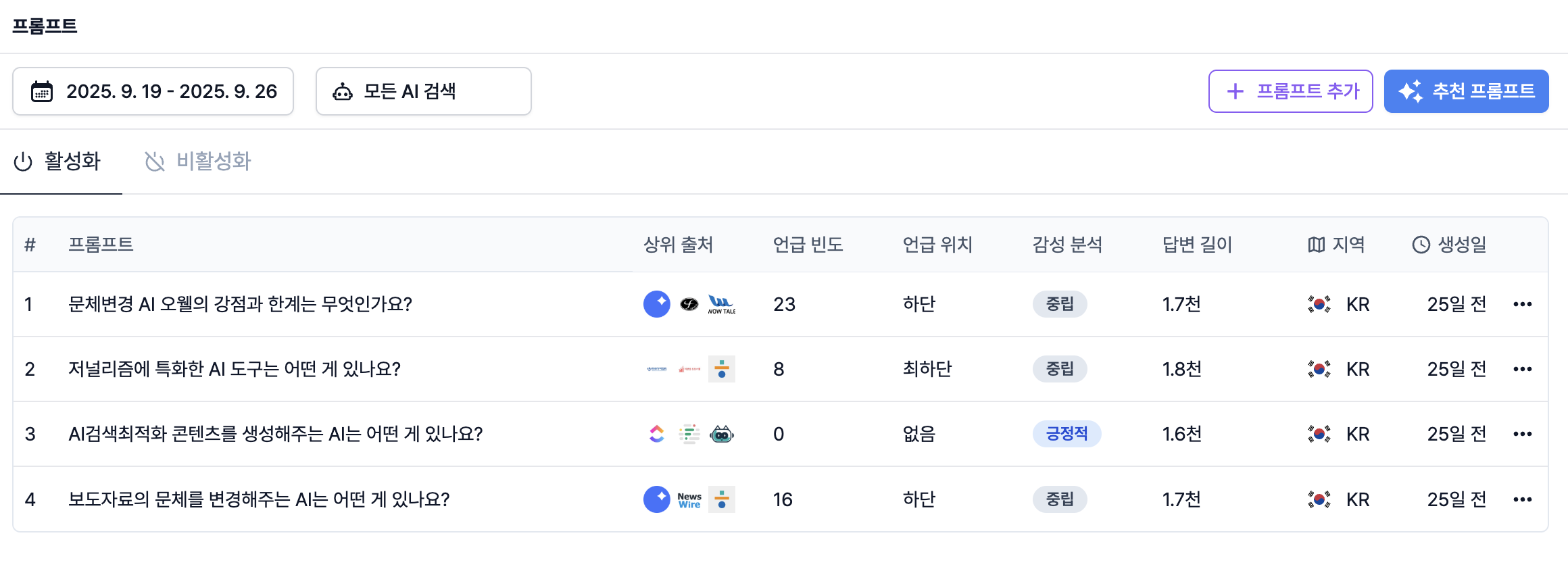 프롬프트를 추가하는데 그치지 않습니다. 이번 개편으로 프롬프트별로 언급 빈도, 언급 위치, 감성 분석, 답변 길이, 지역 등을 모두 관리할 수 있게 됐습니다.