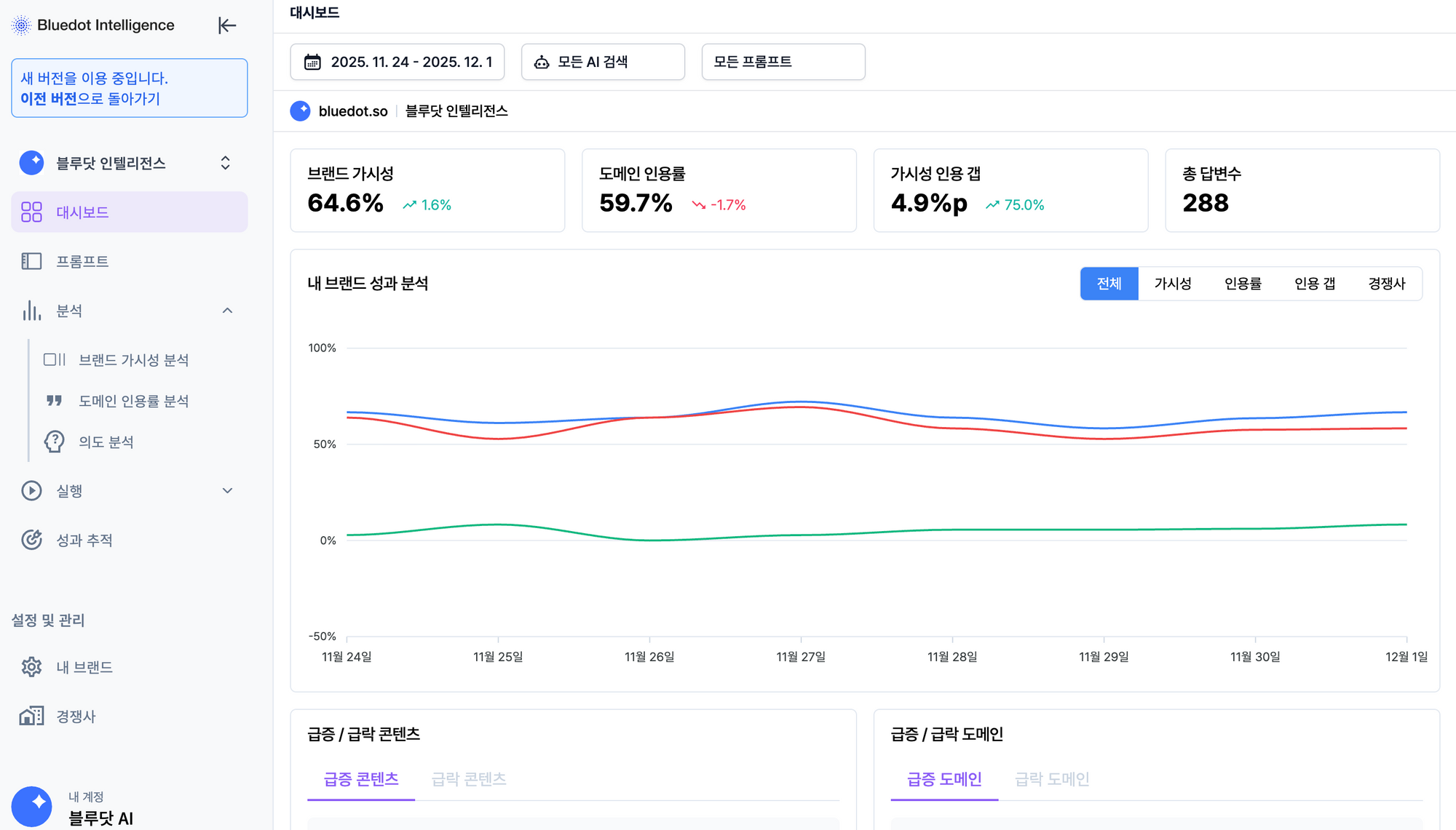 - BII(BlueDot Intelligence Index): 브랜드 가시성과 AI 답변 긍부정 지수를 종합한 독점 지표로 일별 브랜드 위상 모니터링
