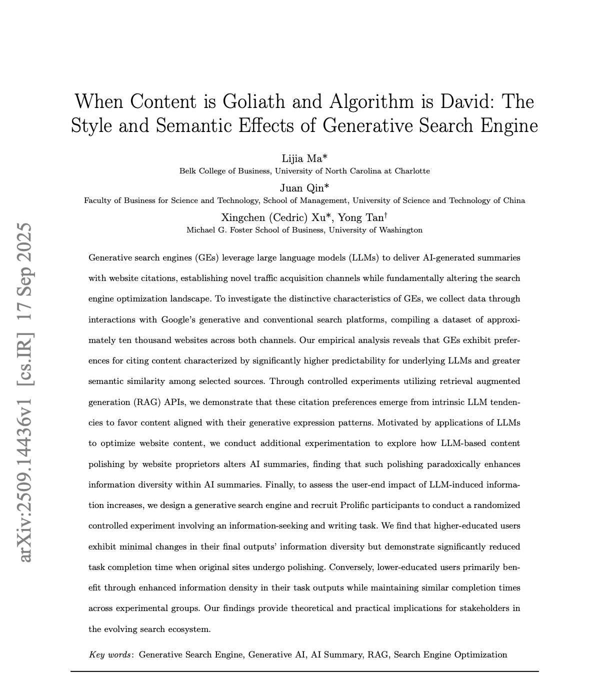 'When Content is Goliath and Algorithm is David: The Style and Semantic Effects of Generative Search Engine' 논문을 발표한 연구진은 구글의 생성형 검색 플랫폼과 기존 검색 플랫폼 간의 상호작용 데이터를 분석하여 생성형 검색 엔진의 독특한 특성을 탐구했습니다. 분석 결과, 생성형 검색 엔진은 LLM의 관점에서 예측 가능성이 높은 콘텐츠, 즉 낮은 혼잡도(Perplexity)를 가지며 선택된 소스들 간의 의미적 유사성(semantic similarity)이 높은 콘텐츠를 인용하는 경향을 보였습니다. 이러한 예측 가능성 측정은 기존 구글 검색 결과 순위에 미미한 영향만을 미쳤으며, 이는 알고리즘적 우선순위 부여 메커니즘의 근본적인 차이를 시사합니다. AI 개요(AI Overview)는 일관되고 통일된 응답을 생성하도록 설계되었기 때문에, 인용된 소스들은 높은 의미적 동질성(semantic homogeneity)을 나타냈습니다.