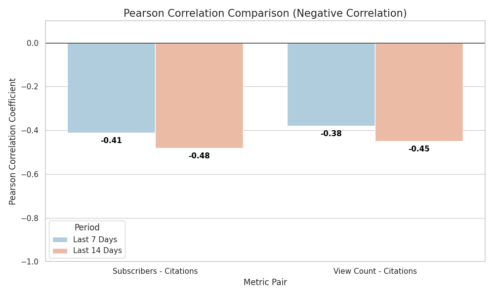 뷰카운트와 인용수 간의 관계도 마찬가지입니다. 7일 간을 분석 기간으로 삼았을 때 -0.38이었던 두 요소 간의 상관관계는 14일로 기간을 늘려잡았을 때 -0.45까지 커집니다.