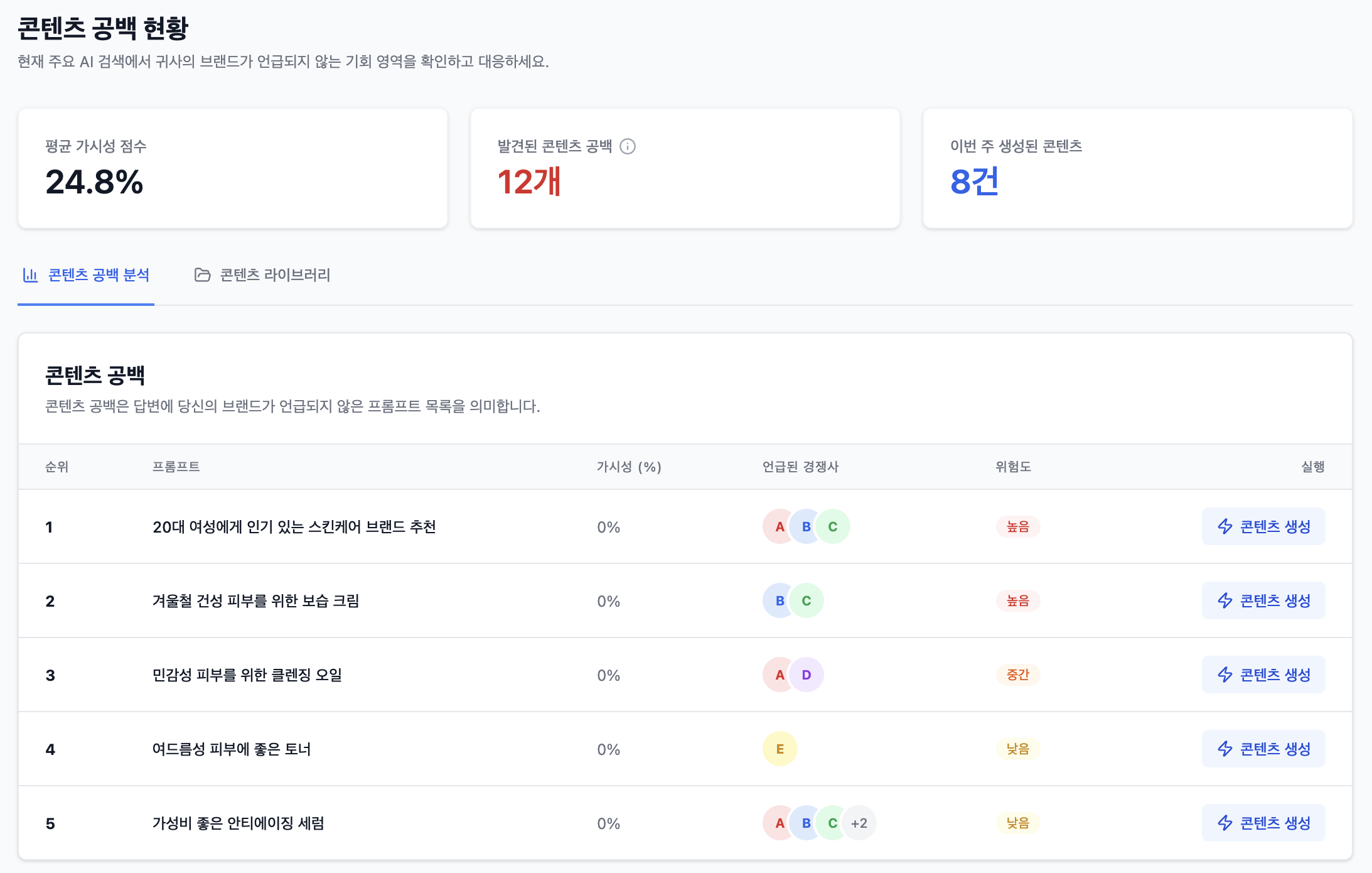 예를 들어보겠습니다. 아래는 저희가 현재 개발 중인 신규 기능 '콘텐츠 공백' 메뉴입니다. 아직 네이밍이 확정되지 않았는데요. 현재 브랜드가 어떤 고객 질문 영역에서 어떤 가시성이나 인용률의 취약점이 나타나고 있는지 여러 지표를 교차확인해서 발견해야 합니다. 그런 뒤 콘텐츠 초안까지 작성할 수 있도록 도와드리려고 합니다.