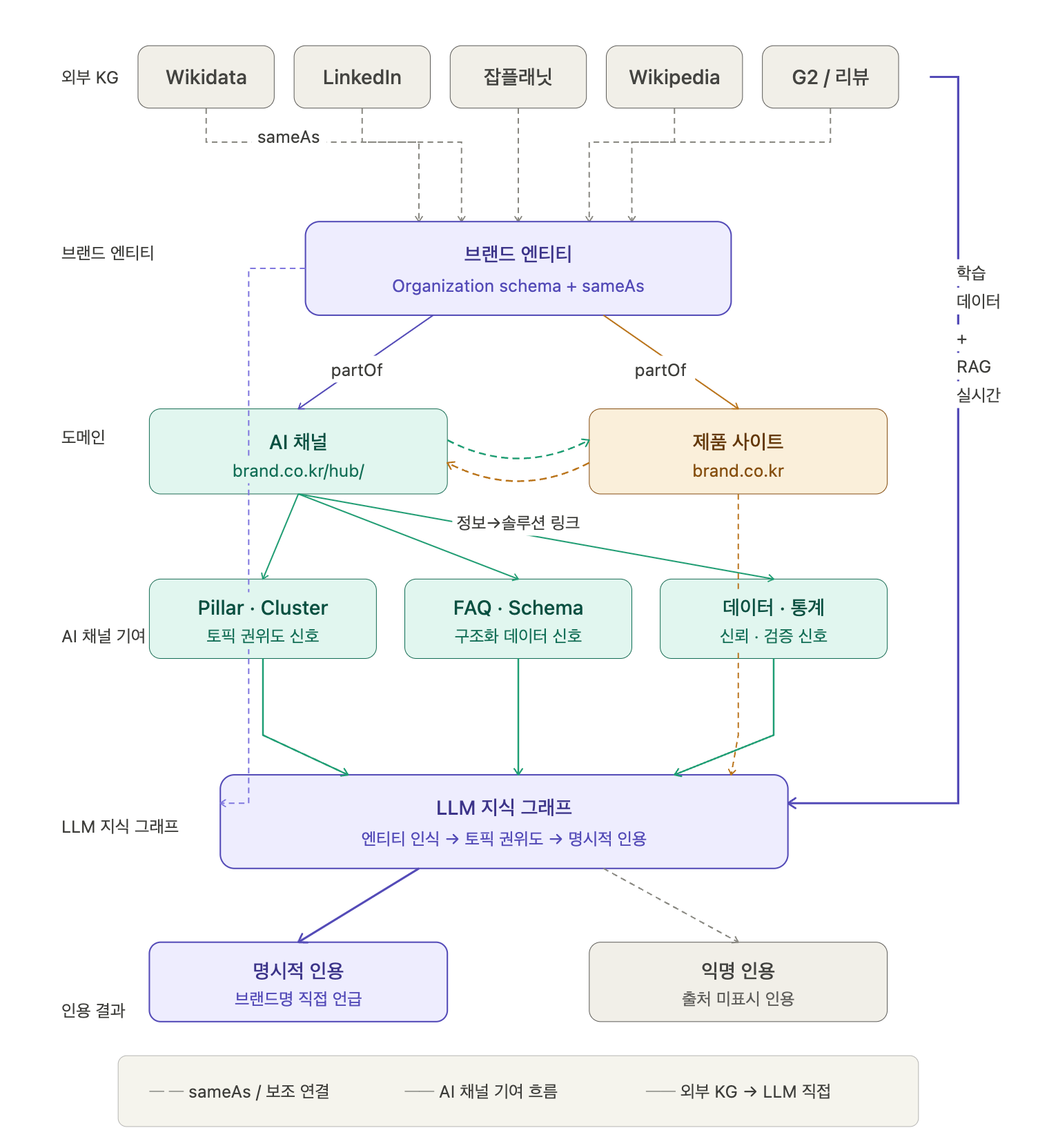 앞서 언급했다시피 AI 채널은 AI 또는 AI검색을 위한 전용 채널입니다. 인간 고객을 핵심 대상으로 설정하지 않습니다. AI검색이 더 잘 발견하고 이해하고 인용하는데 주안점을 둡니다. 그러려면 AI검색의 작동 메커니즘을 이해할 필요가 있습니다. 바로 근간 기술인 RAG(검색증강생성) 나아가 지식 그래프(Knowledge Graph)를 이해해야 합니다.