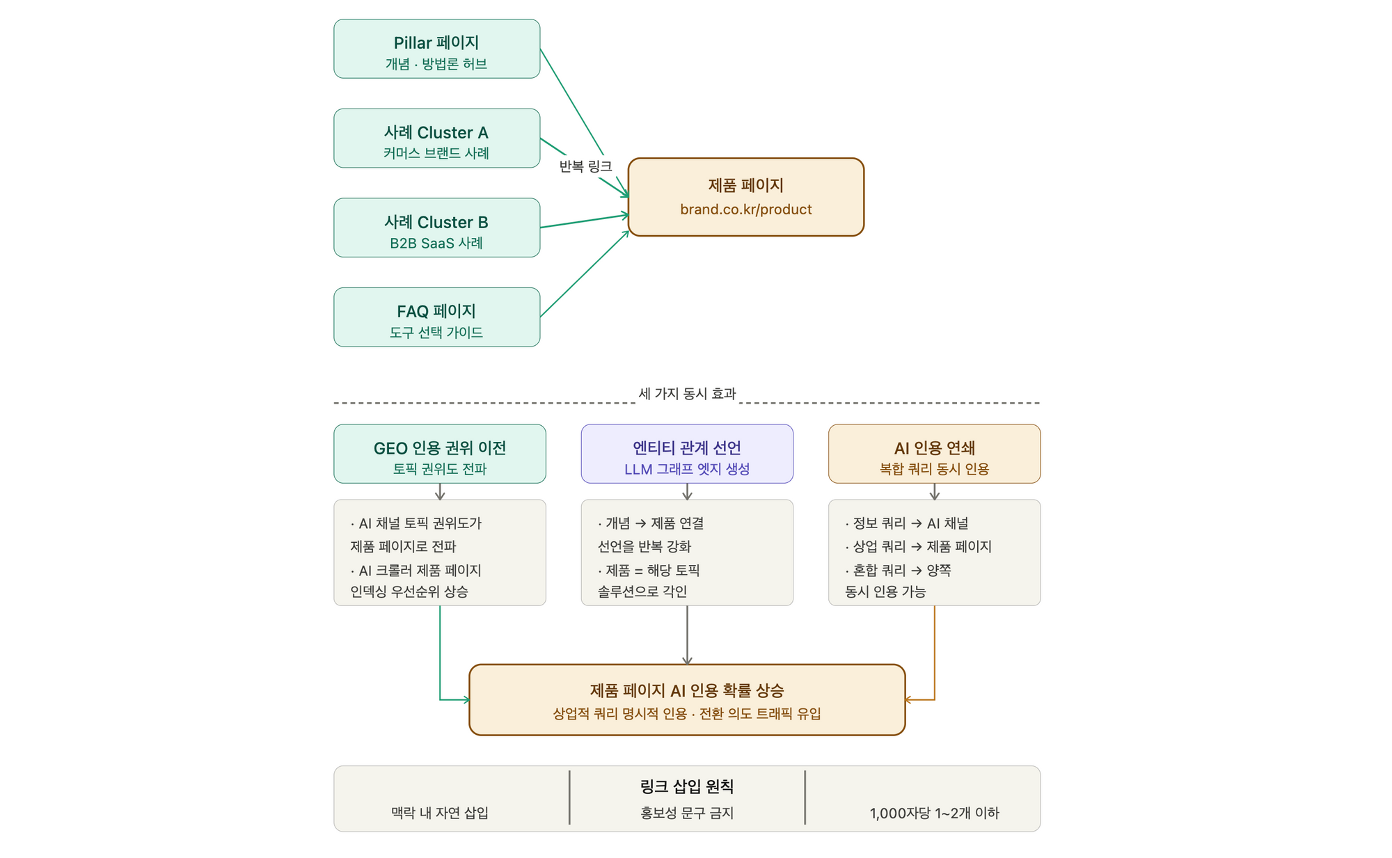 저는 GEO의 핵심은 '콘텐츠 생산'을 통한 맥락의 풍성화라고 보고 있습니다. 기술적 GEO는 금방 해결 가능하지만, 브랜드 엔티티 신뢰도는 그렇게 쉽게 형성되지 않습니다. 이를 장기적으로 구축하는 데 있어서 AI 채널을 필수품이 될 수밖에 없습니다. 아래 다이어그램을 통해 그 로직을 설명드리도록 하겠습니다.