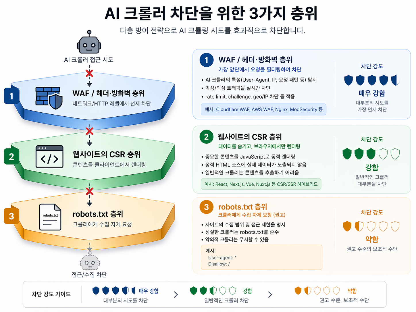 또다른 난관계 부딪히는 경우도 있습니다. 회사의 보안상의 이유로 웹사이트가 아닌 방화면 레벨에서 모든 AI 크롤러를 차단하는 경우입니다. CSR 의 약점을 해결하고 robots.txt의 선언을 바꾸놓는다고 하더라도 WAF와 같은 상위 헤더 수준에서 봇을 막으면 이전 GEO 작업은 무용지물이 됩니다. 이땐 왜 AI 크롤링 봇을 방화벽 수준에서 허용하는지 인프라 보안 담당자를 직접 설득해야 하기도 합니다.